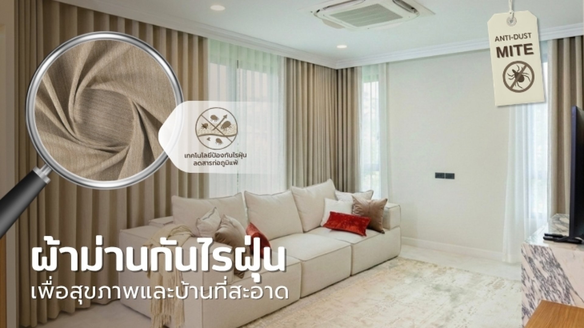 ไรฝุ่น (Dust Mites) และมูลของมันคือสาเหตุหลักของโรคภูมิแพ้ ผ้าม่านที่กันไรฝุ่นได้จริงจะถูกออกแบบมาให้มี Pore Size (ขนาดรูพรุน) ที่เล็กกว่า 10 ไมครอน ทำให้ไรฝุ่นไม่สามารถมุดเข้าไปอาศัยอยู่ภายในเนื้อผ้าได้ ช่วยลดปริมาณสารก่อภูมิแพ้ในห้องนอนได้ถึง 80-90% - เทคโนโลยีเส้นใยและการเคลือบสาร (Innovative Protection)