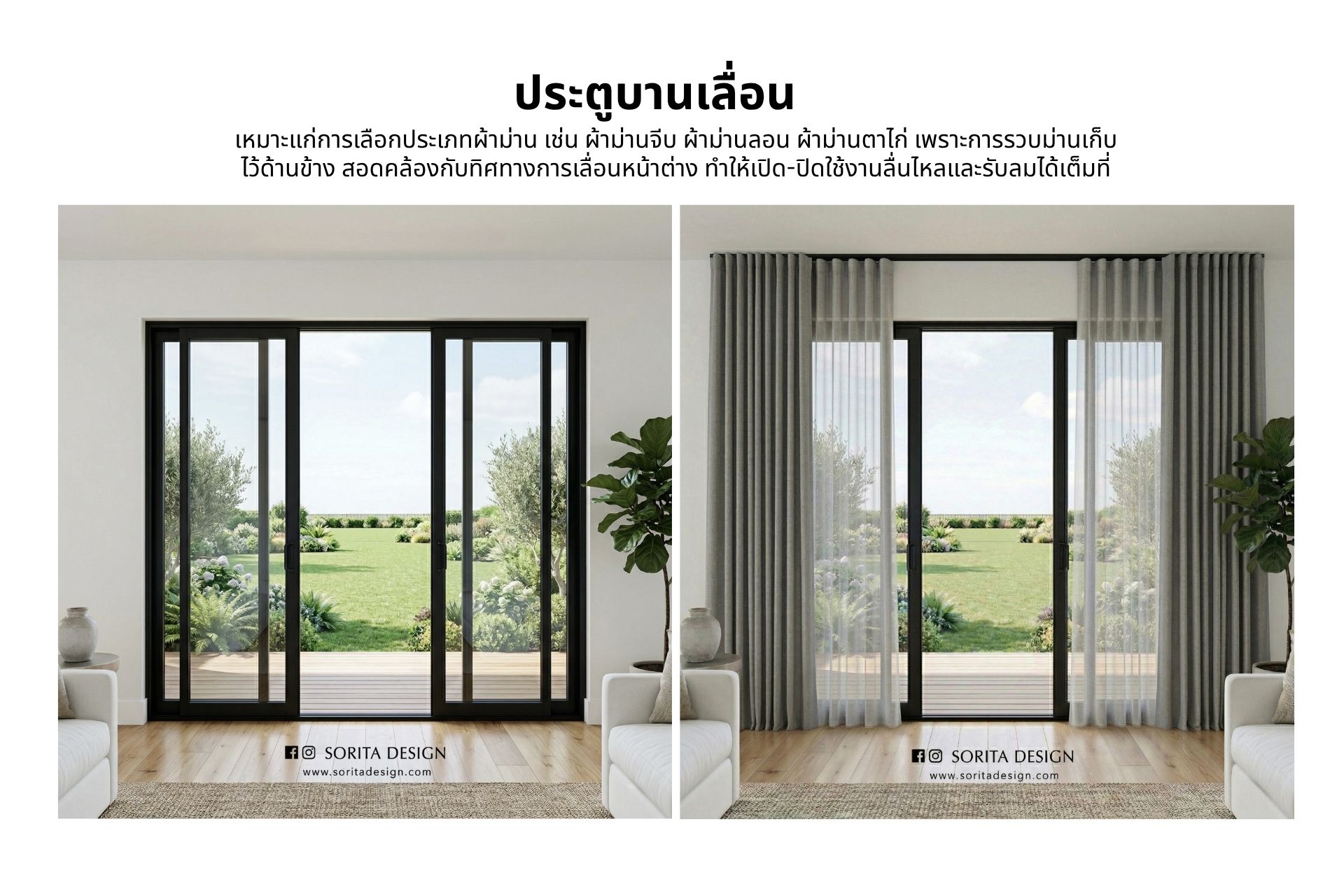 - ม่านที่เหมาะสม: ม่านลอน (Wave Curtains), ม่านจีบ (Pleated Curtains), ม่านตาไก่ (Eyelet Curtains)