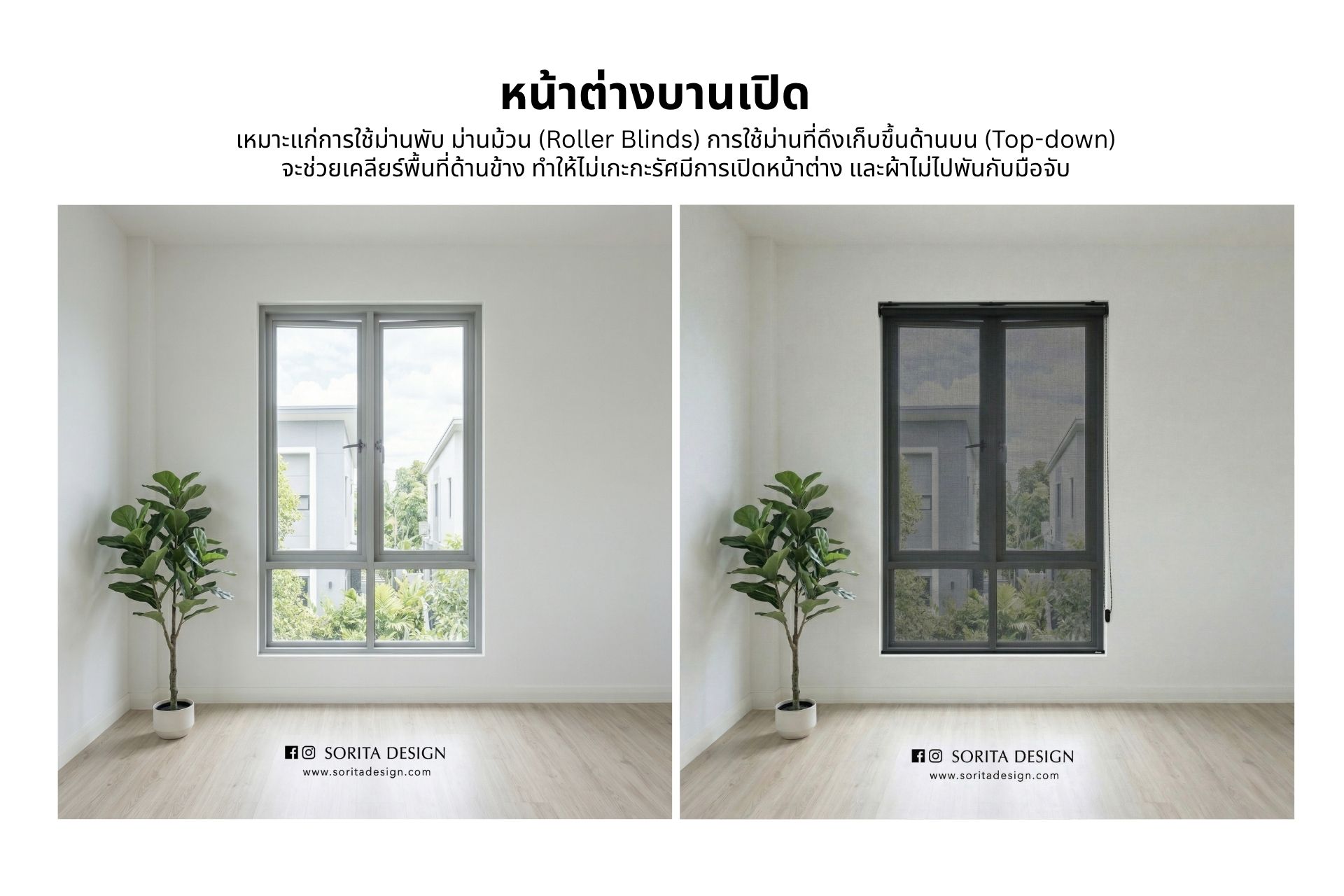 | หน้าต่างบานเปิด | ม่านม้วน ม่านพับ | ประหยัดพื้นที่ ไม่ขวางการสวิงของบานกระจก | ระวังแสงลอดตามขอบด้านข้าง (Light gap) |