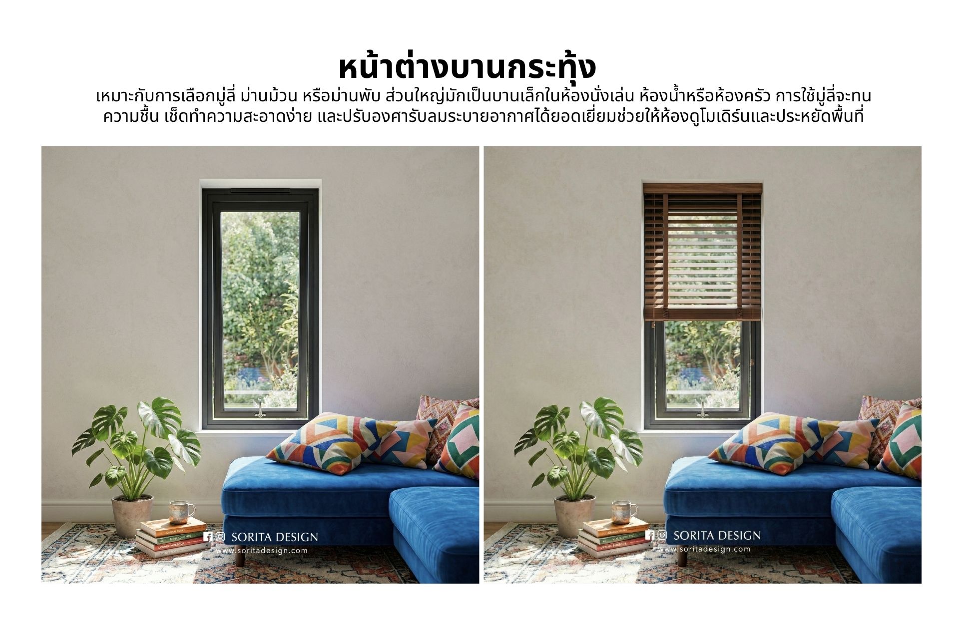 - ม่านที่เหมาะสม: มู่ลี่ไม้/มู่ลี่อะลูมิเนียม (Venetian Blinds), ม่านม้วน (Roller Blinds)