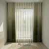 - เหตุผล: กระจกทรงสูงต้องการความโอ่อ่า การใช้ม่านลอนที่ทิ้งตัวตั้งแต่เพดานจรดพื้นจะช่วยนำสายตาให้ห้องดูสูงโปร่งขึ้น (Visual Illusion) และด้วยขนาดที่ใหญ่ น้ำหนักผ้าจะค่อนข้างมาก การใช้ระบบมอเตอร์ไฟฟ้าจะช่วยลดความลำบากในการเปิด-ปิดและถนอมรางม่านในระยะยาว